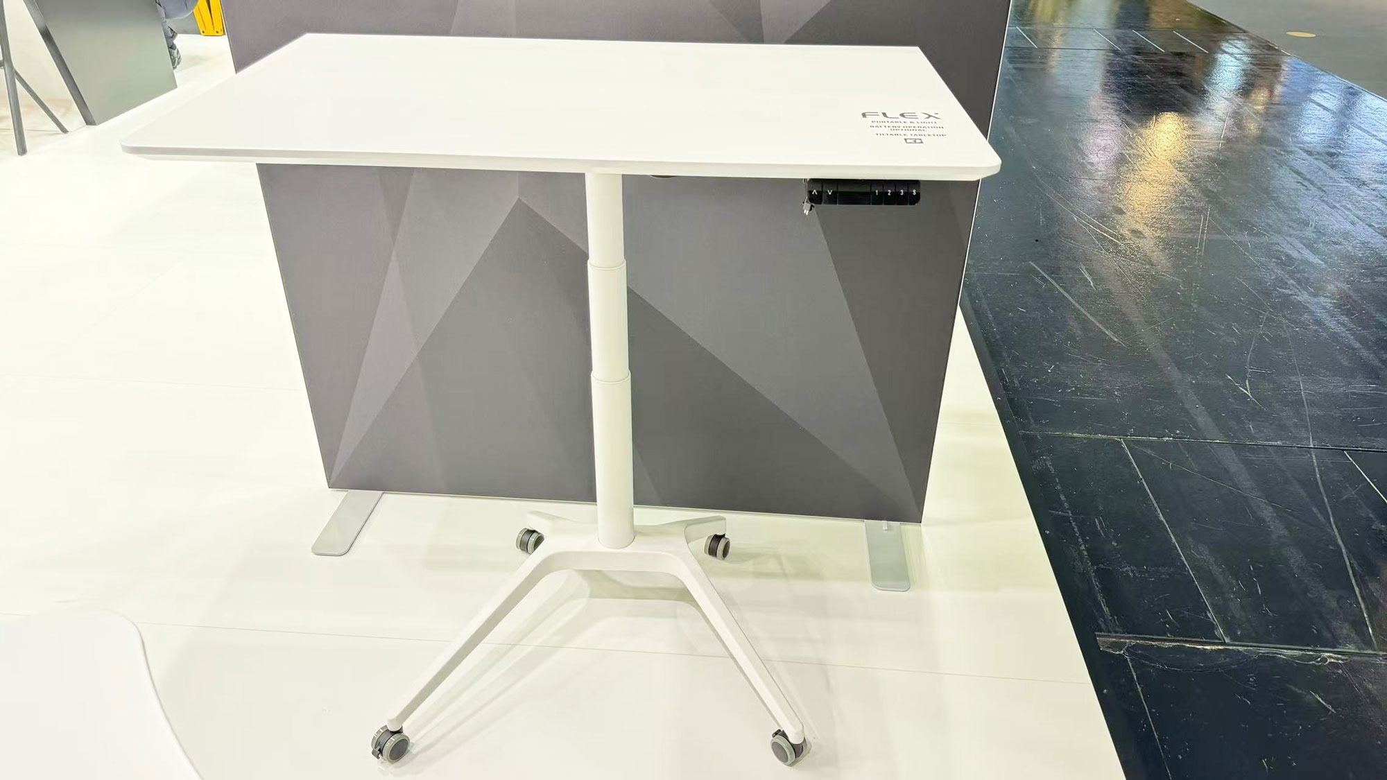 比如,在展会现场我们呈现的单柱可移动升降桌,具有灵活可移动的优势,不仅可以根据使用者的需求自主调节改变桌高实现坐站交替办公,还能轻松移动至多种应用场景来改变工作环境,适合小组之间的临时性沟通协作办公以及在居家环境办公使用。